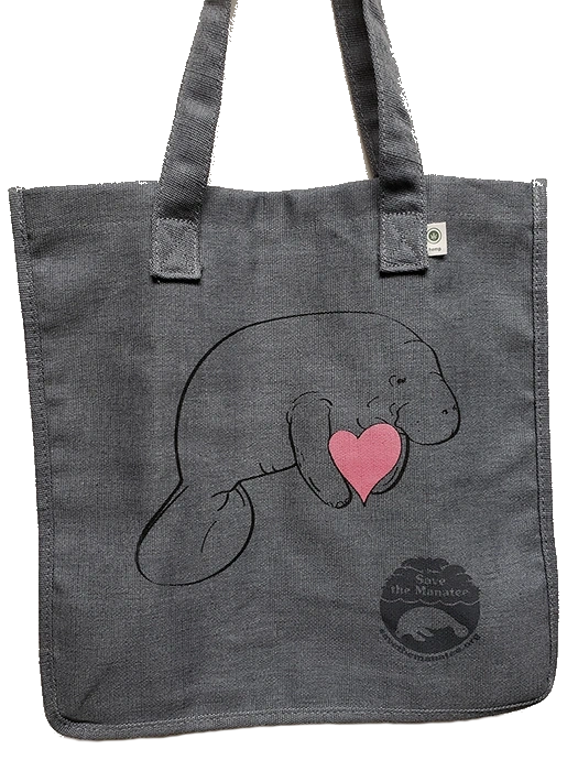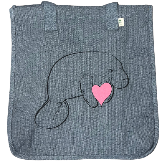 This gray tote features an adorable manatee and heart design. The manatee tote is made of hemp and cotton to be eco-conscious and durable. Made and manufactured in the USA, the tote is designed and printed exclusively for Save the Manatee Club.