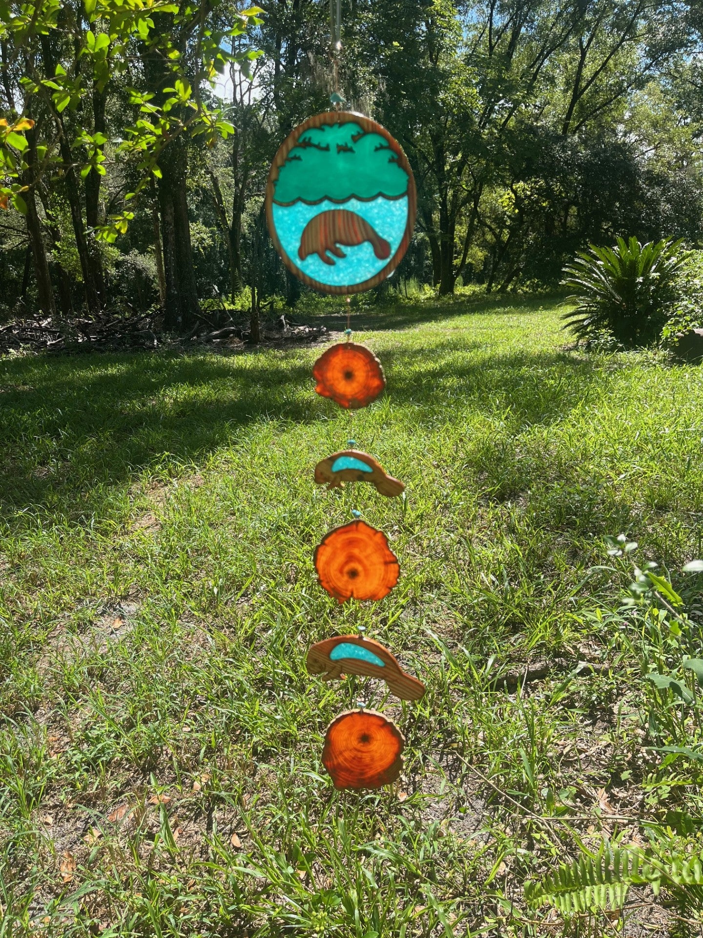 Our logo is displayed at the top, followed by a simple, eye-catching chain of wood rings and manatees. It’s a great piece to hang in a window, on a porch, or in the garden—adding a natural, handmade touch to any space.