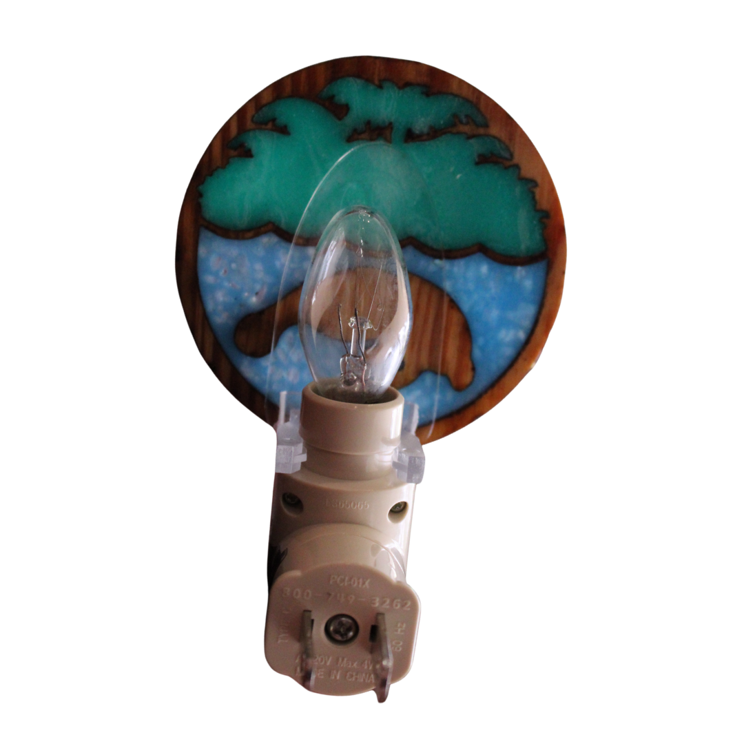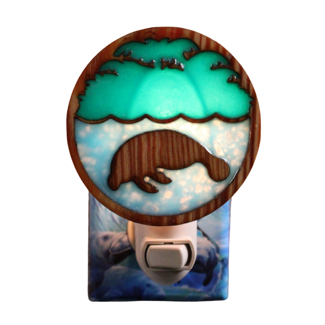 Bring a touch of manatee magic to any room with this unique night light. Featuring a circular wooden charm made from longleaf pine, the design showcases Save the Manatee Club’s logo cut out and filled with shimmering blue and green resin. The 3" wide charm softly diffuses light and can be rotated around the light to fit a variety of outlets and spaces. Perfect for hallways, bathrooms, or bedrooms, this night light combines natural materials with aquatic charm!