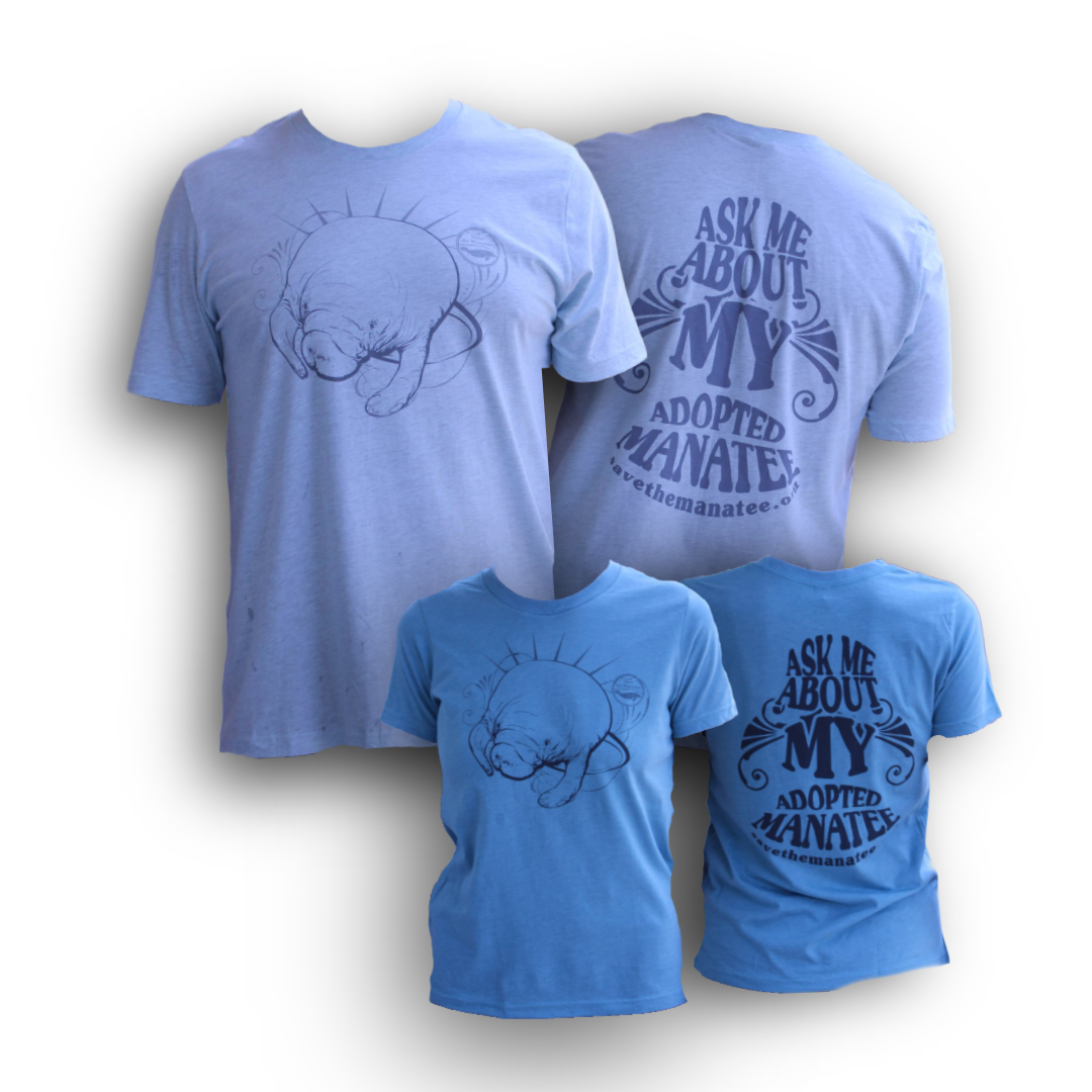 Get ready to spread the love for manatees with this exclusive SMC t-shirt. Featuring a cute manatee stencil design on the front and the phrase "Ask Me About My Adopted Manatee" on the back. Made of a soft and luxurious blend of cotton and polyester in a light blue-grey heather color. Get ready to make a statement and support these gentle giants!