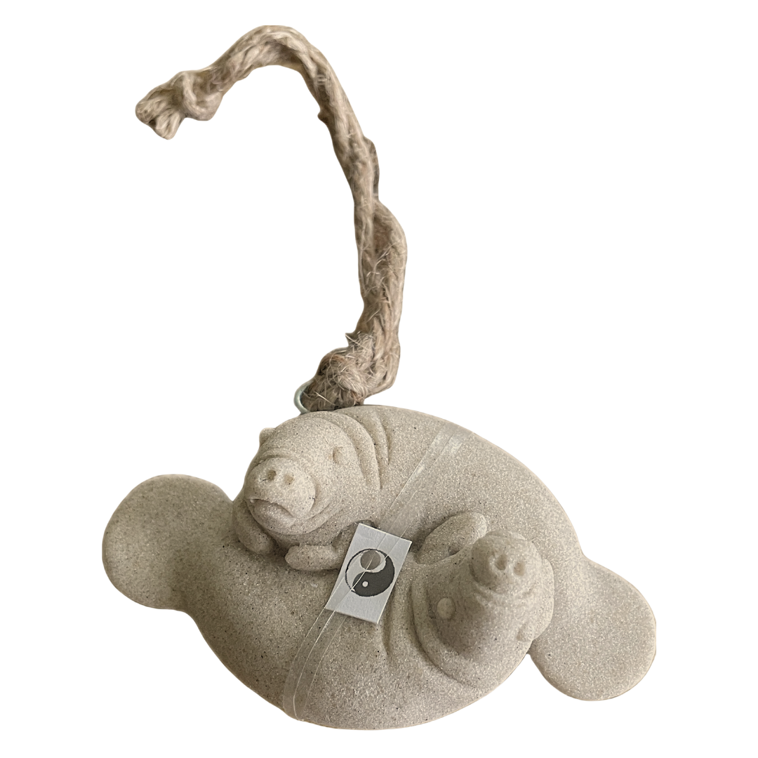 This handmade ornament features two cuddling manatees in a yin yang shape, symbolizing balance and connection. Crafted from natural sand, it measures approximately 4 inches long by 1 1/2 inches wide—perfect for a windowsill, mantelpiece, or as a thoughtful keepsake.